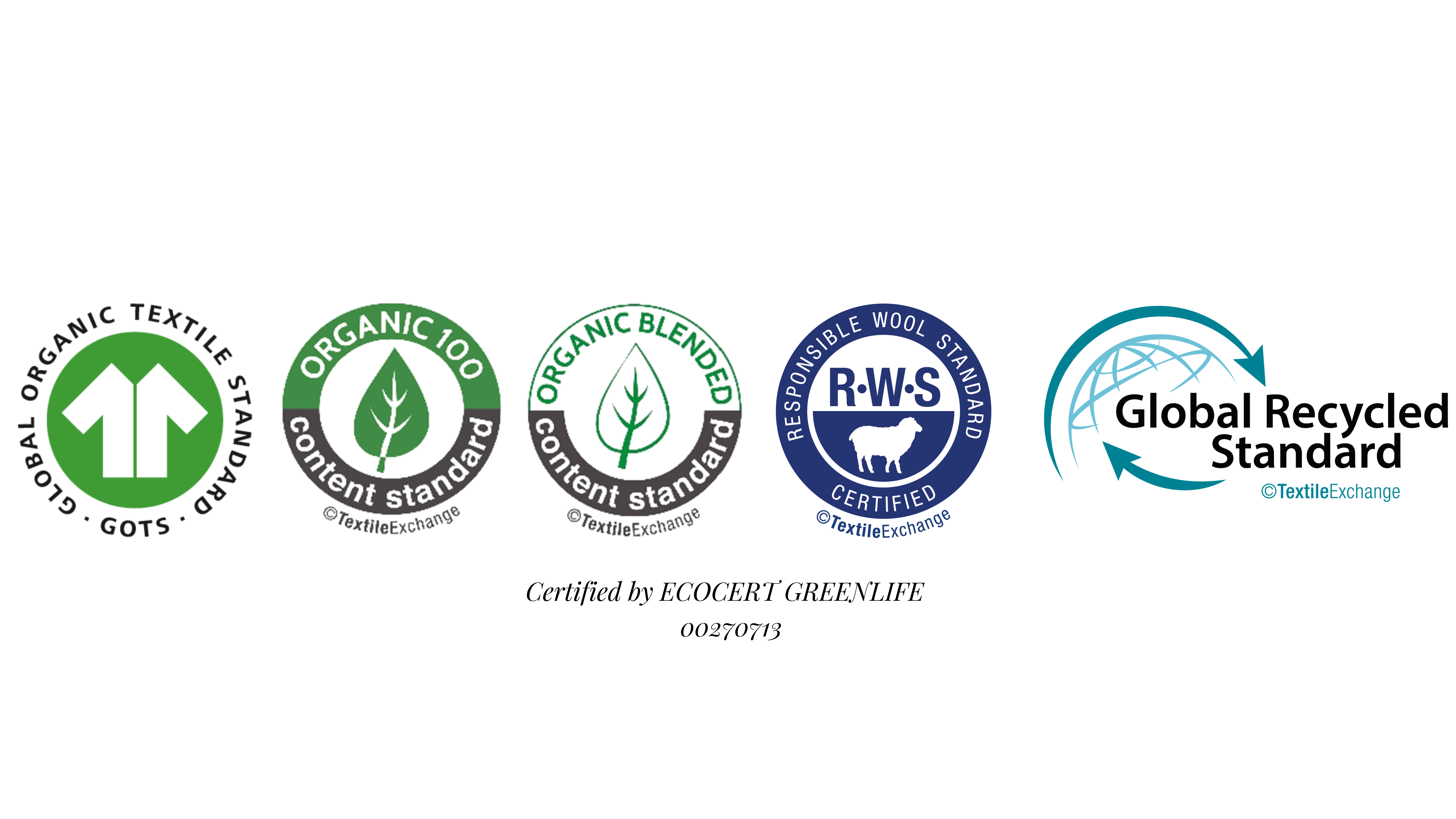 Since 2017, we have been proudly certified by the Global Organic Textile Standard (GOTS), the world's leading processing standard for organic fiber textiles. GOTS ensures the organic integrity of our products from raw material harvest onwards, requiring environmental and social responsibility throughout the production process. This annual in-person monitoring provides our clients with a credible guarantee of our 100% certified supply chain and our dedication to fulfilling our social duties.In 2022, we embarked on a new chapter by investing in two additional certifications: the Global Recycled Standard (GRS) and the Responsible Wool Standard (RWS).